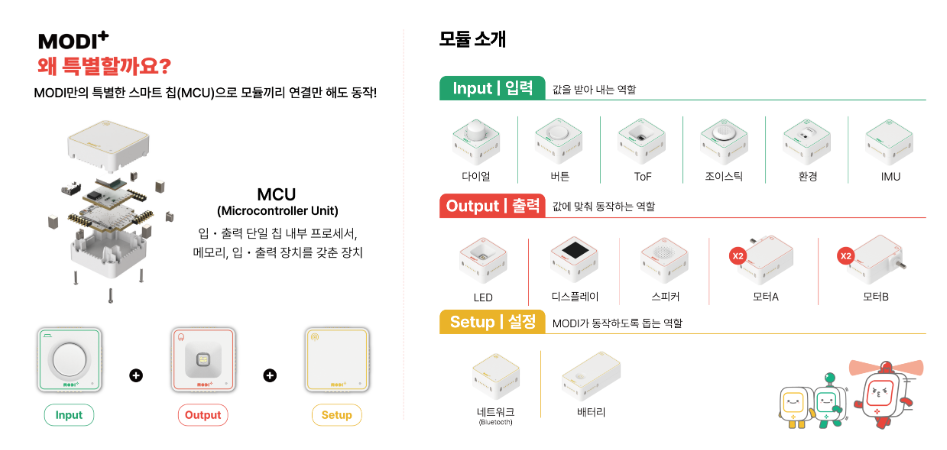 - 코딩의 기초학습 (언플러그드 등) -논리적 사고력 향상 단계 (일상생활 속의 코딩 예시를 MODI를 통해 직접해보며 학습) | -코딩 프로그램 학습 - 알고리즘 및 문제 해결 능력 향상 단계 (MODI 소프트웨어 통해 개념 및 방법 학습) | -로봇 프로그래밍 (다양한 응용 실습 사례를 통해 응용 학습 진행) |